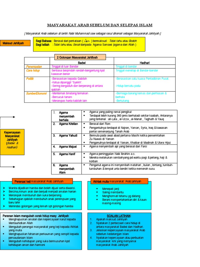 Mempunyai nota bersama kaedah mengingat yg sgt berkesan terdapat analisis SPM terkini dan kaedah menjawab soalan sejarah utk kertas 2. Zaman sebelum kedatangan Islam dikenali sebagai zaman Jahiliah iaitu bermula dari tempoh keruntuhan empangan maarib sehingga zaman kedatangan Islam 610 M Ciri-ciri masyarakat Jahiliah tidak mempunyai nabi dan rasul serta kitab suci sebagai panduan. Masyarakat tidak ada nabi dan kitab suci sebagai petunjuk.